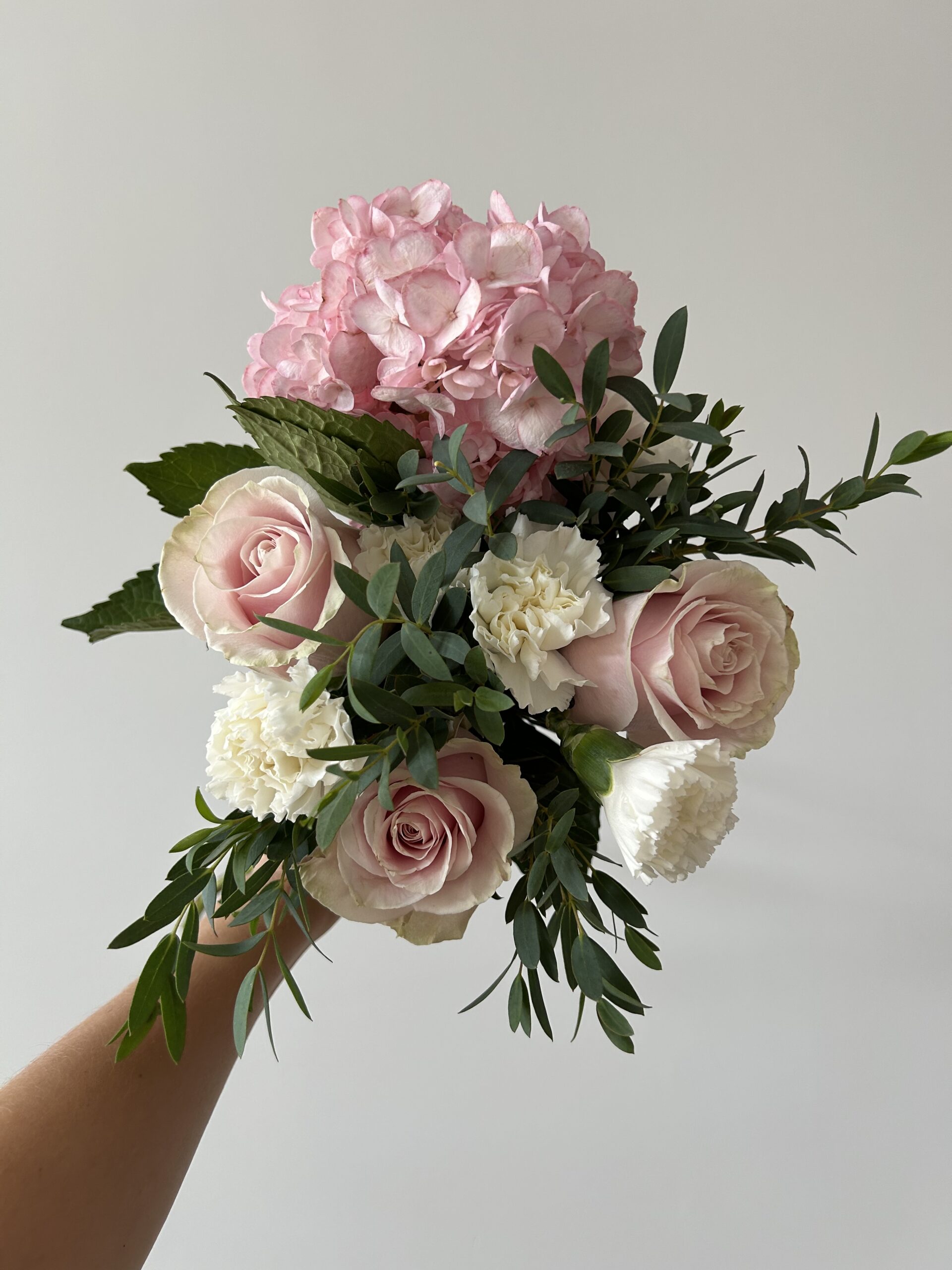 A delicate, feminine bouquet with a timeless, vintage softness. Rosewater Keepsake features a lush pink hydrangea paired with muted blush roses and creamy carnations, all nestled within natural greenery. The palette is gentle and romantic, creating a bouquet that feels elegant, airy, and beautifully refined.
