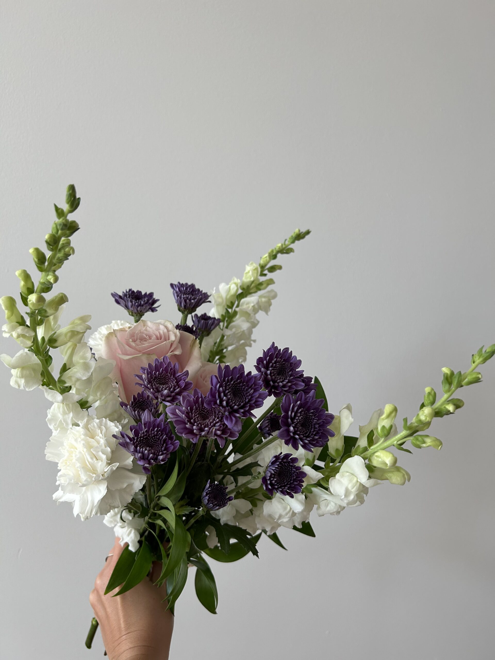 A striking, elegant bouquet where deep violet tones meet soft pastels. Midnight Porcelain features rich plum chrysanthemums, creamy white snapdragons, delicate carnations, and a muted blush rose at the center. Fresh greenery adds gentle structure, giving the bouquet a refined, modern silhouette with beautiful height and movement.
