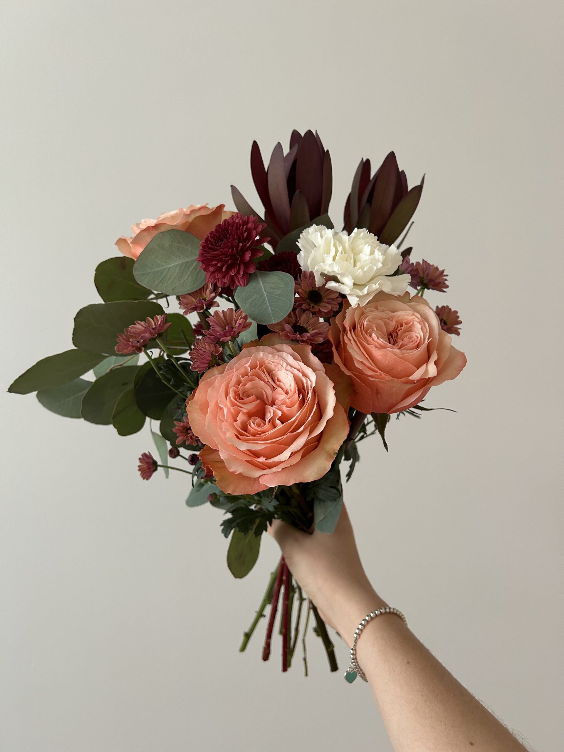 A warm, sculptural bouquet inspired by autumn light and rich natural tones. Autumn Rosette Vale features lush apricot garden roses, deep burgundy chrysanthemums, soft cream carnations, and bold wine-toned foliage for contrast. Eucalyptus adds gentle flow and movement, creating a bouquet that feels modern, elegant, and beautifully layered.