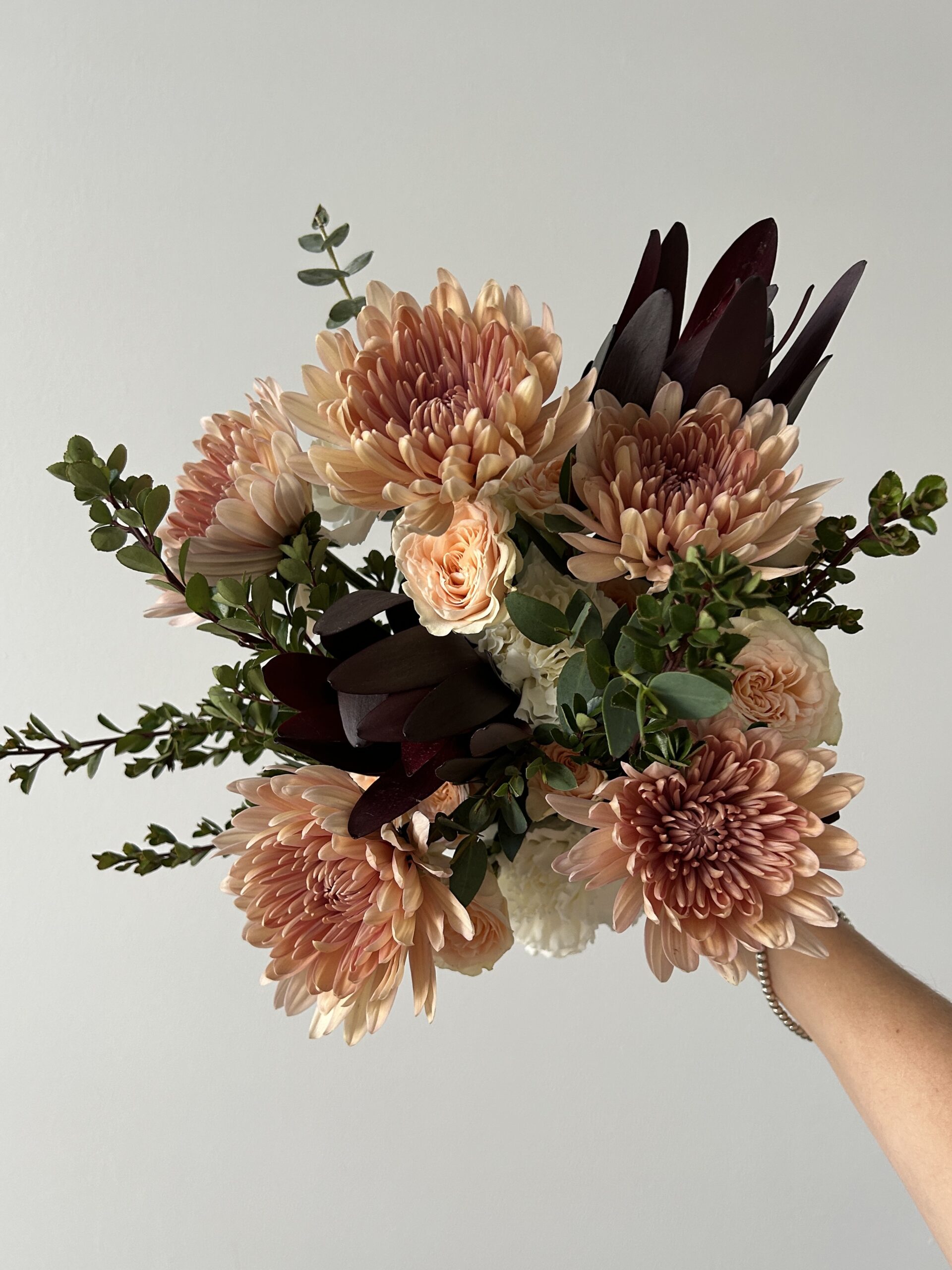 A warm, textural bouquet with rich autumn undertones. Autumn Honey Vale features plush caramel chrysanthemums, petite apricot spray roses, creamy carnations, and deep burgundy foliage for contrast. Fresh greenery adds movement and softness, creating an elegant, modern composition full of depth and glow.