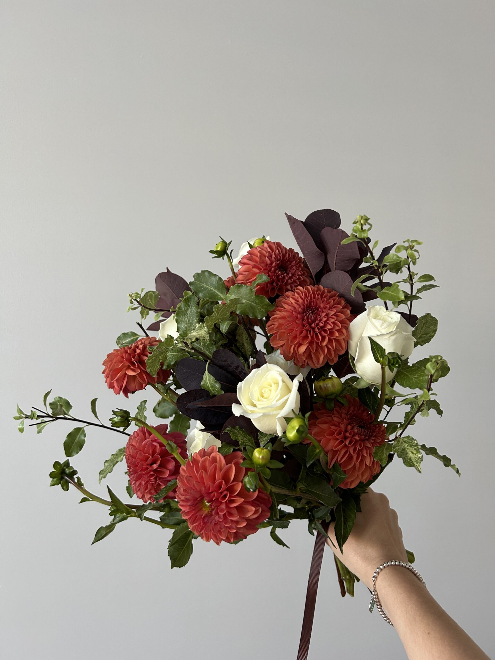 A striking, sculptural bouquet inspired by autumn’s warm richness. Dahlia Emberwood features vibrant burnt-orange dahlias, creamy white roses, deep plum foliage, and glossy green berries for added texture. Branchy greenery and ivy create natural movement, giving the bouquet a wild yet refined silhouette.