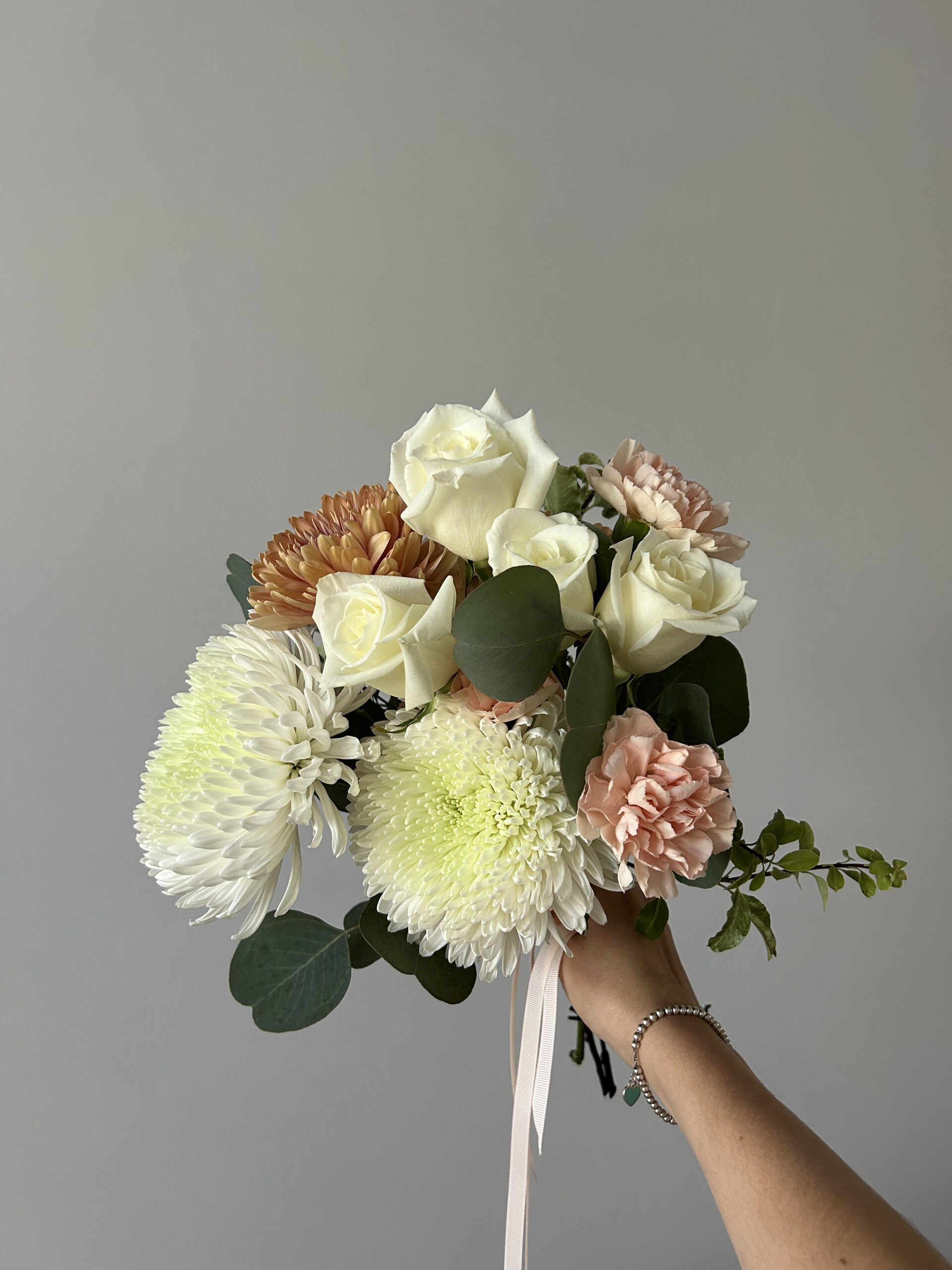 A serene, luminous bouquet with soft, romantic tones. Ivory Petal Solstice features creamy white roses, plush white spider mums, warm honey-bronze chrysanthemums, and blush carnations, all intertwined with fresh eucalyptus and subtle greenery. The palette feels airy and elegant, creating a bouquet that’s both calming and beautifully sophisticated.