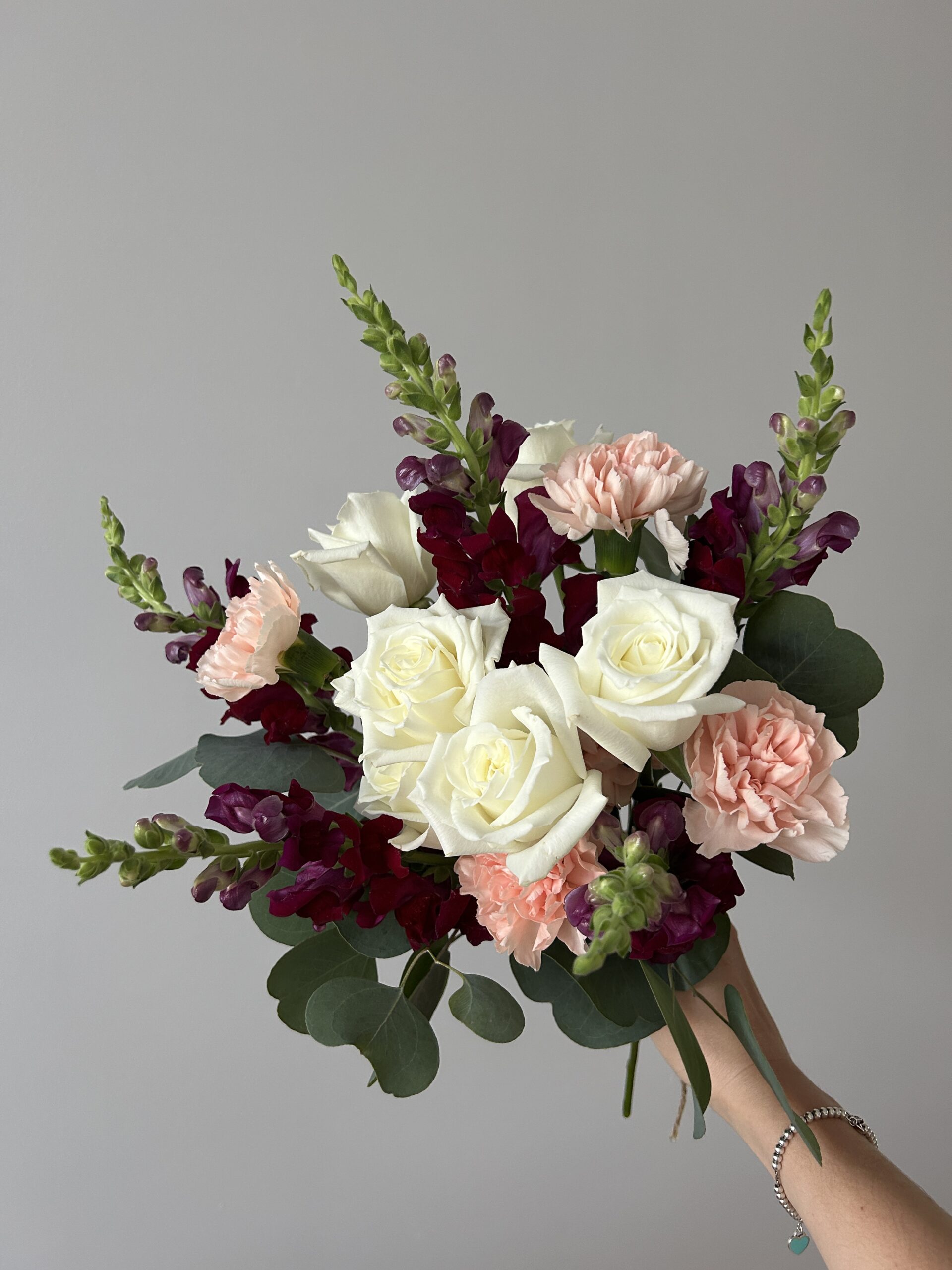 A sophisticated bouquet blending soft romance with bold contrast. Bordeaux Petal Reverie features creamy white roses, blush carnations, and rich merlot snapdragons, tied together with fresh eucalyptus for structure and flow. The palette feels timeless yet modern — elegant ivory paired with deep berry tones creates a beautifully balanced, luxe look.