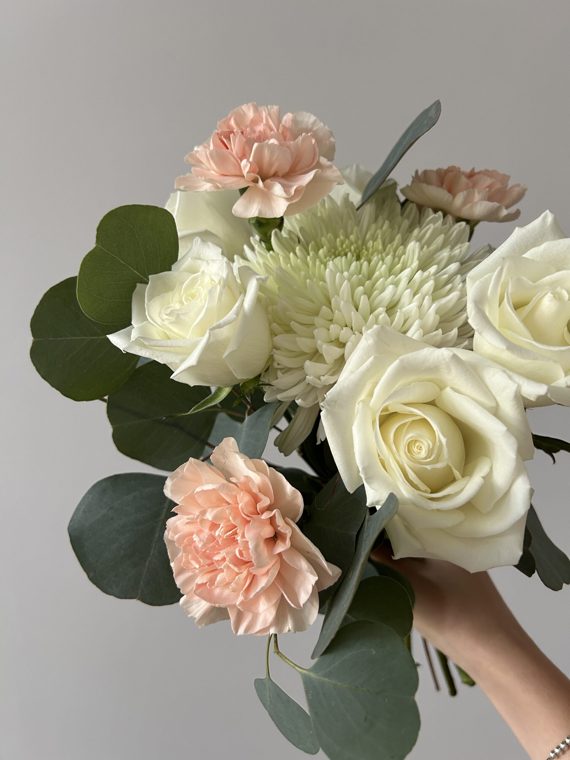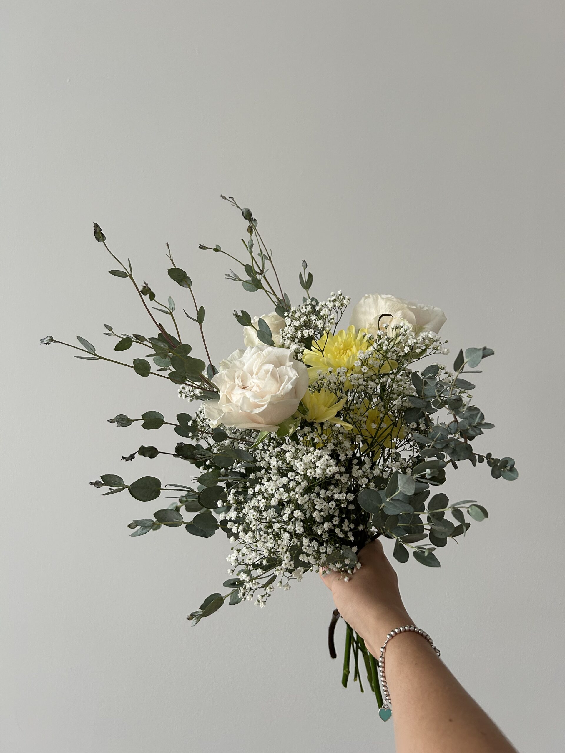 A light and ethereal bouquet with a fresh, clean aesthetic. Ivory Breeze features soft ivory roses, delicate baby’s breath, sunny yellow mums, and airy eucalyptus branches that add beautiful height and movement. The palette feels calm, bright, and uplifting — perfect for someone who appreciates simplicity with a touch of elegance.