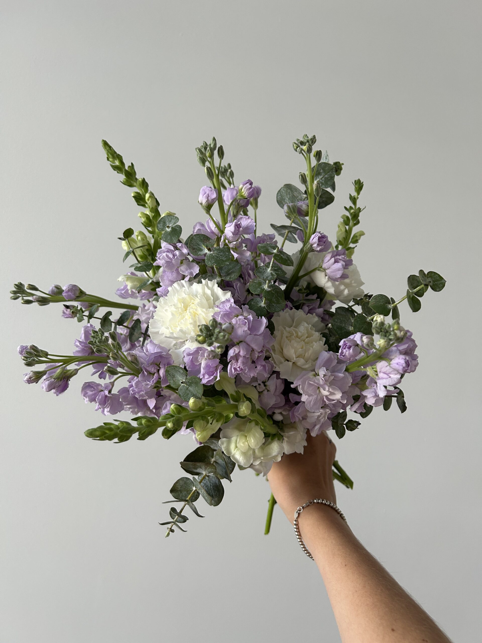 A soft, tranquil bouquet inspired by morning light and gentle pastel tones. Mist & Moonlight features lush lilac stock, creamy carnations, and fresh eucalyptus woven throughout to add height and movement. The cool, airy palette creates a soothing, elegant feel — perfect for someone who loves understated beauty with a refined, modern touch.