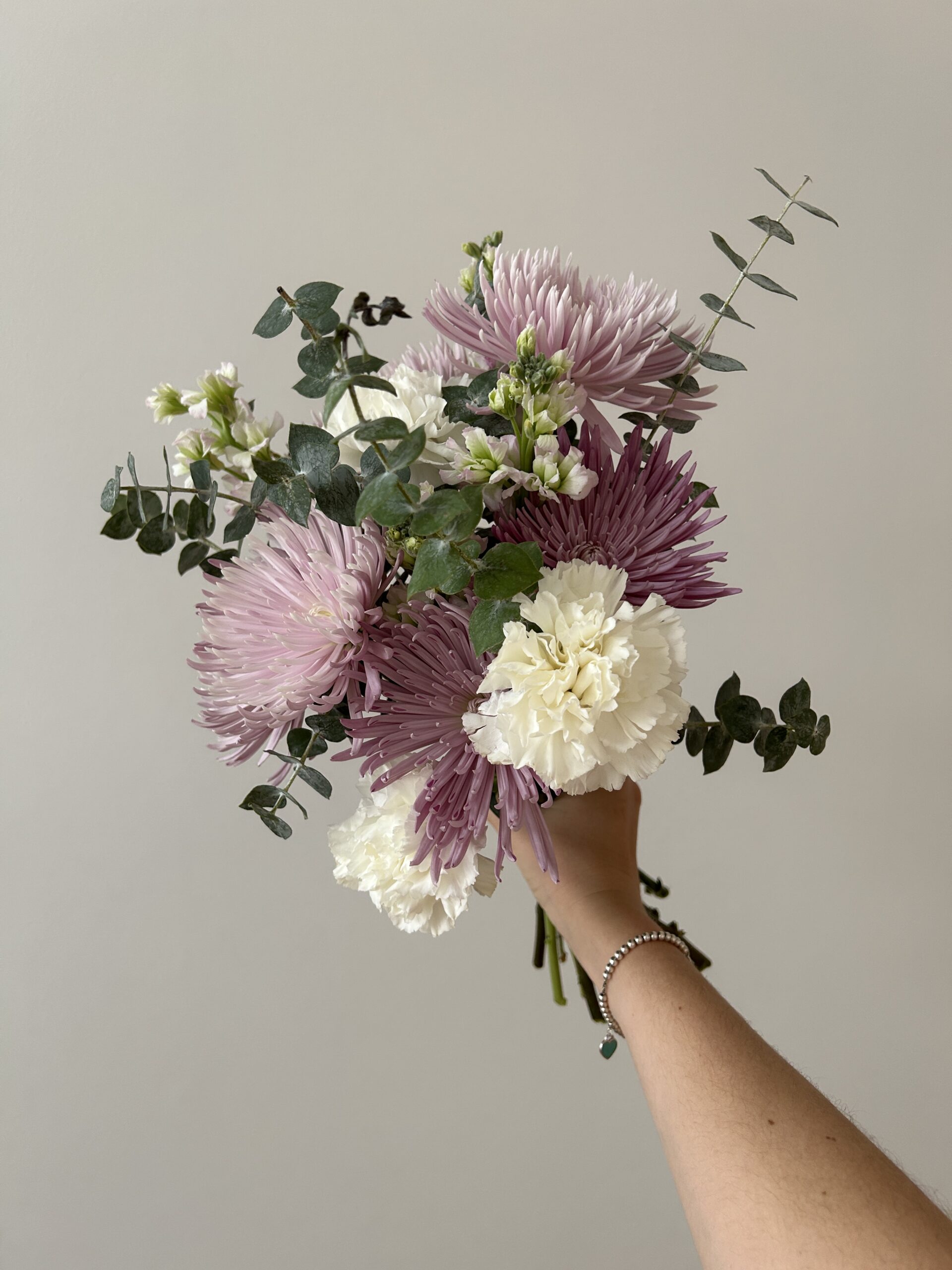 A dreamy, cool-toned bouquet full of soft texture and gentle colour. Lilac Frost Bloom features feathery spider mums in shades of mauve and lilac, paired with creamy carnations, delicate stock blooms, and fresh eucalyptus for movement. The palette feels calm, airy, and effortlessly elegant — a refined choice for those who love soft florals with a modern touch.
